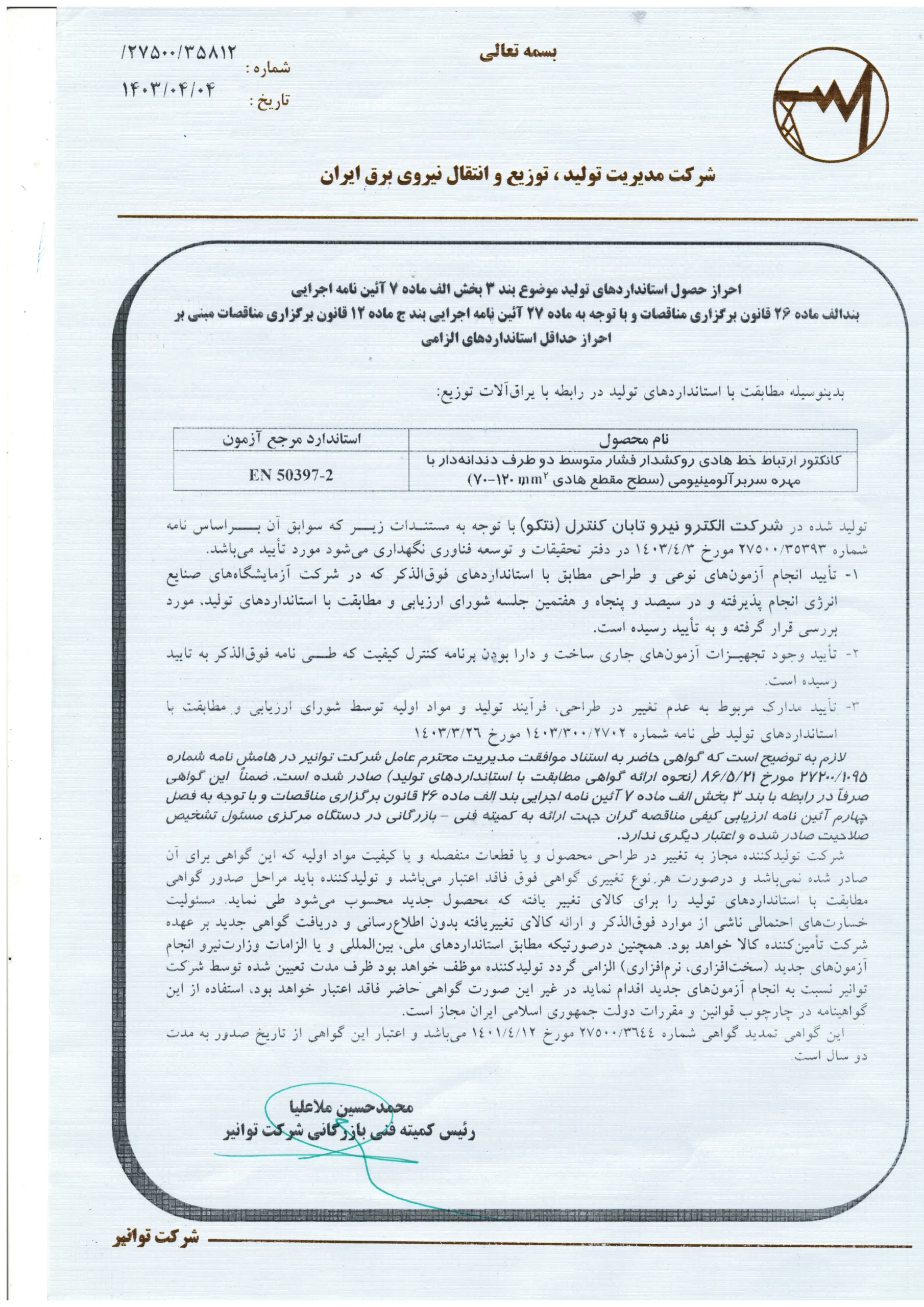 شرکت مهندسی الکترو نیرو تابان کنترل (نتکو) فعالیت خود را از سال 1388 با هدف تولید یراق آلات شبکه های کابل خودنگهدار با رویکرد کاهش تلفات و انرژی های توزیع نشده و آموزش نصب استاندارد این نوع یراق آلات با تکیه براستاندارد CENELEC ردیف EN50483 آغاز نمود و توانست مجوزهای لازم جهت ورود به وندور لیست کلیه شرکت های توزیع و شرکت توانیر را به دست آورد. این مجموعه با جذب نیروهای متخصص فنی و کارشناسان خبره در زمینه تولید یراق آلات شعار “کیفیت پایدار- تولید ماندگار” را سر لوحه کلیه فعالیتهای خود قرار داده است و با افتخار محصولاتی کاملا ایرانی را تولید می کند. شرکت نتکو با تجهیز آزمایشگاه های مکانیک برق – الکترونیک و شیمی همواره کیفیت محصولات خود را تحت کنترل قرار داده ونام خود را در لیست سازندگان تایید صلاحیت شده شرکت توانیر وکلیه وندورلیستهای شرکت های توزیع سراسر کشور به ثبت رسانده است. برآنیم که با امید به پروردگار متعال و با گسترش فعالیت و کسب تاییدیه های برون فردی در آینده صادرات محصولات خود را به سایر کشورها توسعه دهیم.