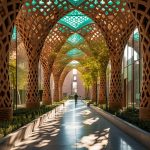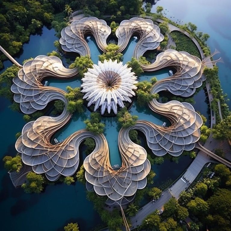 The structure of each “petal” is composed of curved, multi-layered levels that extend in an undulating, wave-like pattern upwards and downwards. This design is not only visually striking but can also aid in reducing wind impact, managing sunlight, and creating shade. These structures could be constructed from materials like wood or steel.