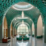 This corridor is designed with a geometric and curved lattice ceiling, reminiscent of Islamic mosaics and the roofs of traditional museums. This pattern is inspired by the principles of Islamic architecture, executed in a modern and contemporary style using wood and glass.