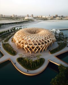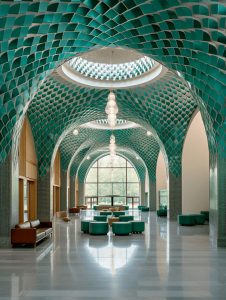 1. Lattice and Geometric Ceiling: Inspired by Islamic Architecture This corridor is designed with a geometric and curved lattice ceiling,